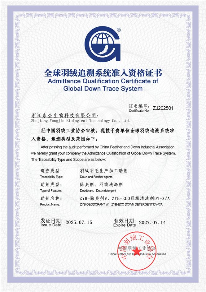 新闻动态|喜讯:浙江永金生物正式加入全球羽绒追溯系统! 浙江永金生物科技有限公司作为中国羽绒工业协会理事单位我们研制的羽绒助剂已经正式加入由中国羽绒工业协会主导的全球羽绒追溯系统本次接入后我司的羽绒助剂将实现与全球羽...
