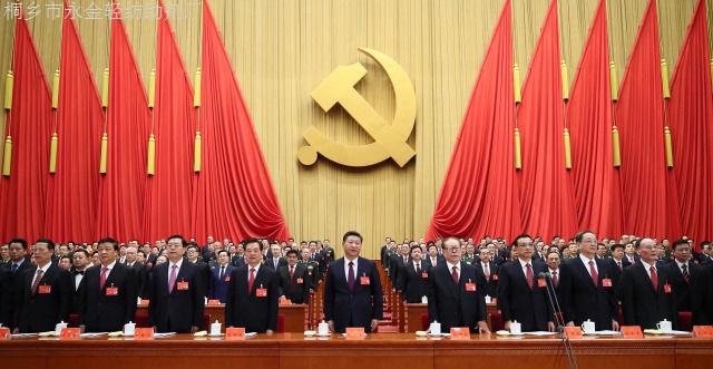 人民大会堂雄伟庄严,万人大礼堂气氛热烈。主席台上方悬挂着“中国共产党第十九次全国代表大会”的会标,后幕正中是镰刀和锤头组成的党徽,10面鲜艳的红旗分列两侧。二楼和三楼眺台上分别悬挂着“不忘初心,牢记使命,高举中国特色社会主义伟大旗帜,决胜全面建成小康社会,夺取新时代中国特色社会主义伟大胜利,为实现中华民族伟大复兴的中国梦不懈奋斗!”“伟大、光荣、正确的中国共产党万岁!”的横幅。