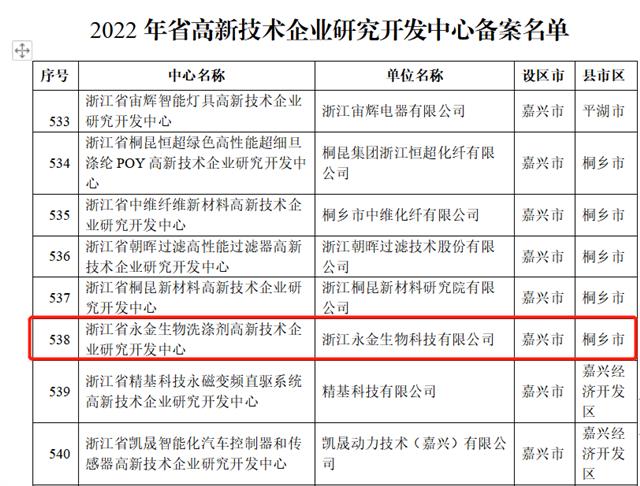 2023年1月11日,根据浙江省科学技术厅《关于公布2022年新认定省级企业研发机构名单的通知》,浙江省永金生物洗涤剂高新技术企业研究开发中心被认定为2022年省高新技术企业研究开发中心。