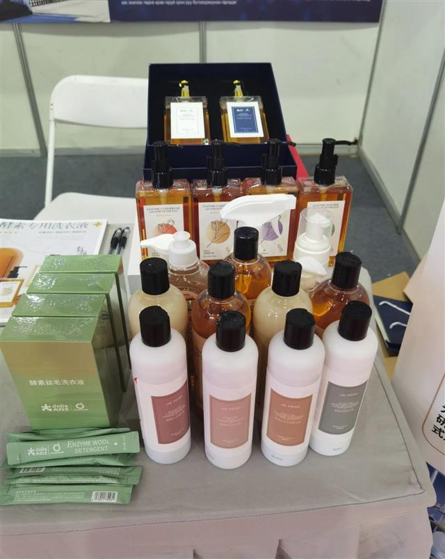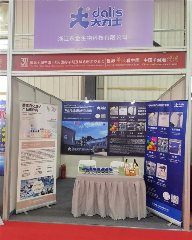浙江永金生物科技有限公司积极参加本次交易会,为参展人员展现公司所研发生产的洗涤剂、和毛油、抗静电剂、渗透剂、柔软剂等工业羊毛助剂,以及羊毛羊绒洗衣液等酵素日化洗护产品。