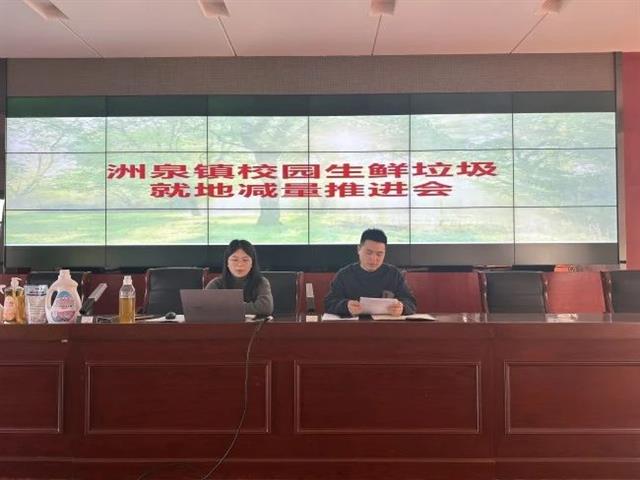 一次专题会议。洲泉镇联合浙江永金生物科技有限公司召开洲泉镇校园生鲜垃圾就地减量推进会,会上向各所学校老师解释生鲜垃圾回收利用后制成酵素产业化的过程。