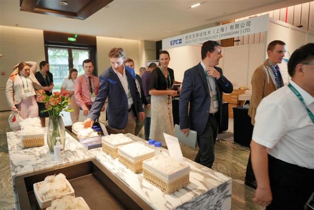 浙江永金生物科技有限公司作为中方赞助商,在会议大厅设立了精美展台,展出了工业助剂及使用工业助剂加工制成的相关产品,吸引了行业人士交流探讨。