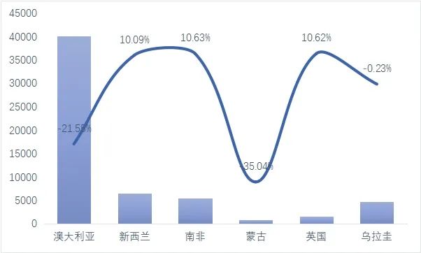 1~3月中国进口主要产毛国羊毛数量与同比情况(单位:吨,%)