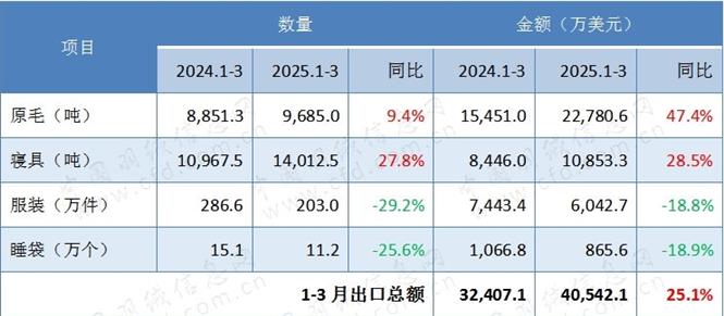 2025年一季度,我国羽绒行业出口总额约4.1亿美元,同比上涨25.1%,与1-2月相比,涨幅扩大1.1个百分点。分产品来看,原毛和寝具出口量值齐增,二者出口量...