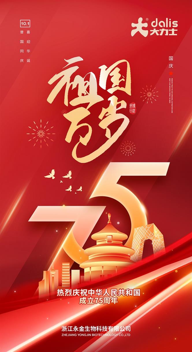 盛世华诞举国同庆 金秋送爽,丹桂飘香九州同庆,四海欢歌 我们迎来了祖国75岁的生日!在这举国同庆的喜庆时刻浙江永金生物科技有限公司:向祖国母亲献上最诚挚的祝福!