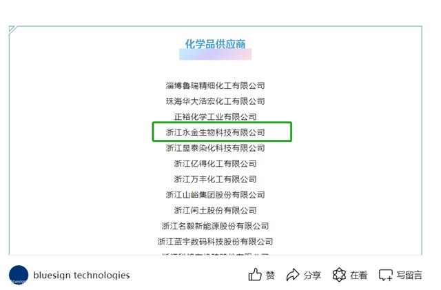 成为蓝标合作伙伴,是公司持续优化生产和管理过程,落实可持续发展战略的重要里程碑。浙江永金生物科技有限公司将继续秉承绿色环保、健康安全、可持续发展的理念,立足于生物技术创新,坚持科技创新和发展,致力于为客户提供高质量、高安全性的产品和服务。同时,公司将进一步加强对环保和安全的管理和监控,持续提高公司的生产和管理水平。