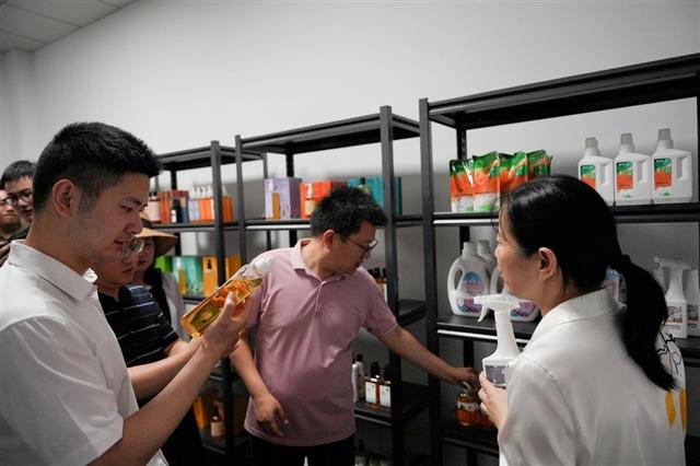 领导们参观了永金生物科技有限公司研发生产的酵素类产品,他们对这些酵素洗护用品、酵素清洁用品等产品产生了浓厚的兴趣,纷纷向前询问产品的购买渠道,并为果蔬酵素为原料的天然产品竖起大拇指。